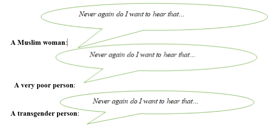 Look at the pieces of people’s identities. Imagine the person sharing this identity lives in your country. How would this person finish the sentence below? If you share these characteristics, refer to your own experiences. Write down the possible endings: